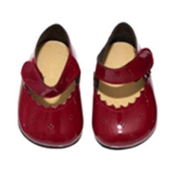 Små fine mørkerøde laksko med “blondedetaljer”, Dukkeskoene har en lille rem henover foden, der lukker med velcro, skoene har fast bund med en lille hæl.
