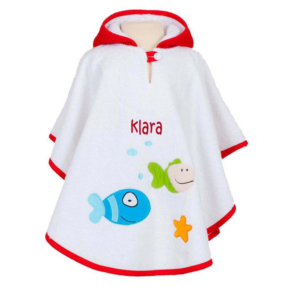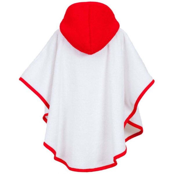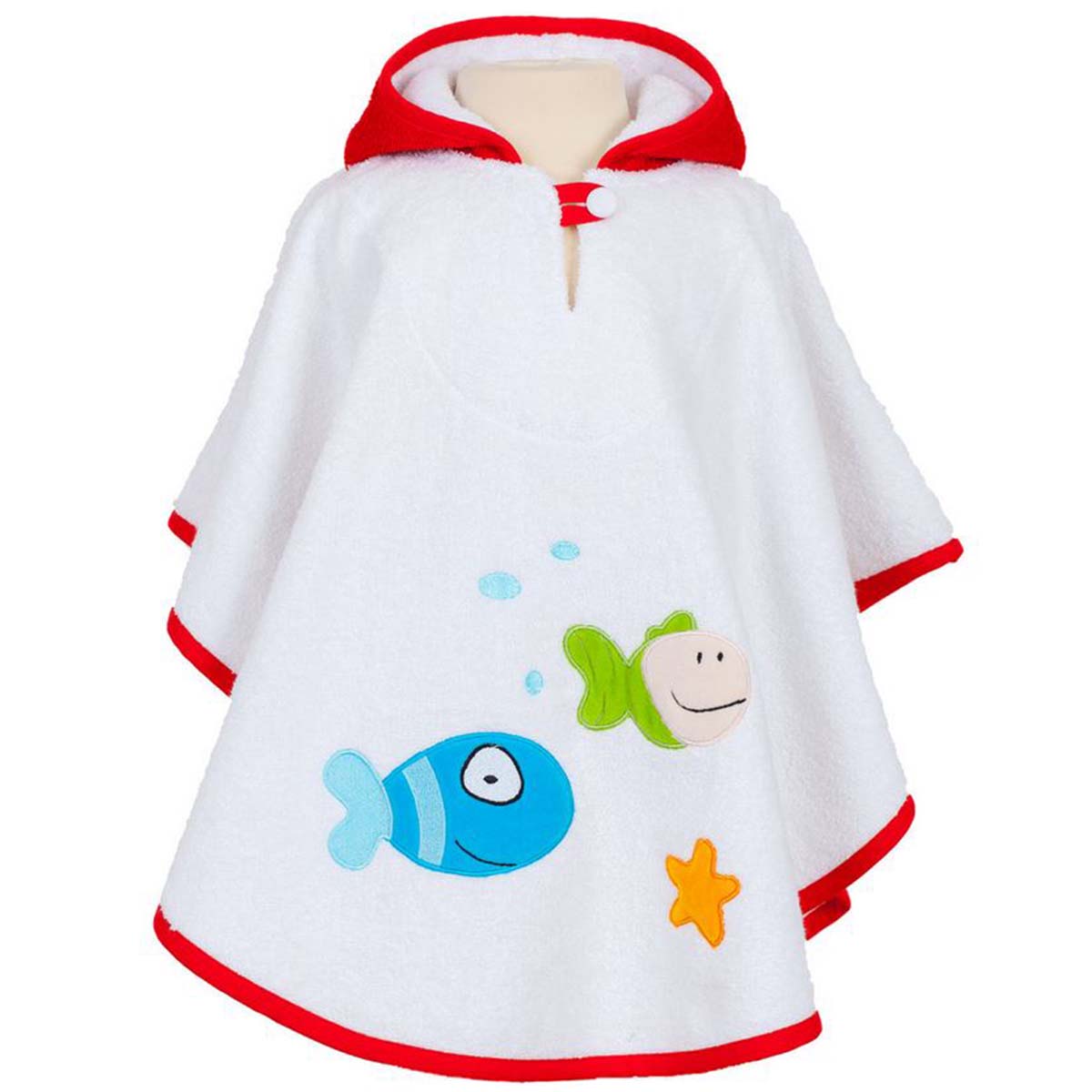Denne skønne badeponcho i hvid frotte med en iøjnefaldende rød hætte og kant er et fantastisk alternativ til en traditionel morgenkåbe. Den er både praktisk og sjov, og har fine fisk og havdyr applikeret foran, hvilket gør den ekstra charmerende og perfekt til den lille, der elsker havet og vandleg.