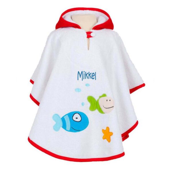 - Havdyrs-applikation for ekstra charme – De fine fisk og havdyr på forsiden gør ponchoen til noget særligt. Dit barn vil elske at finde på lege med havtema!