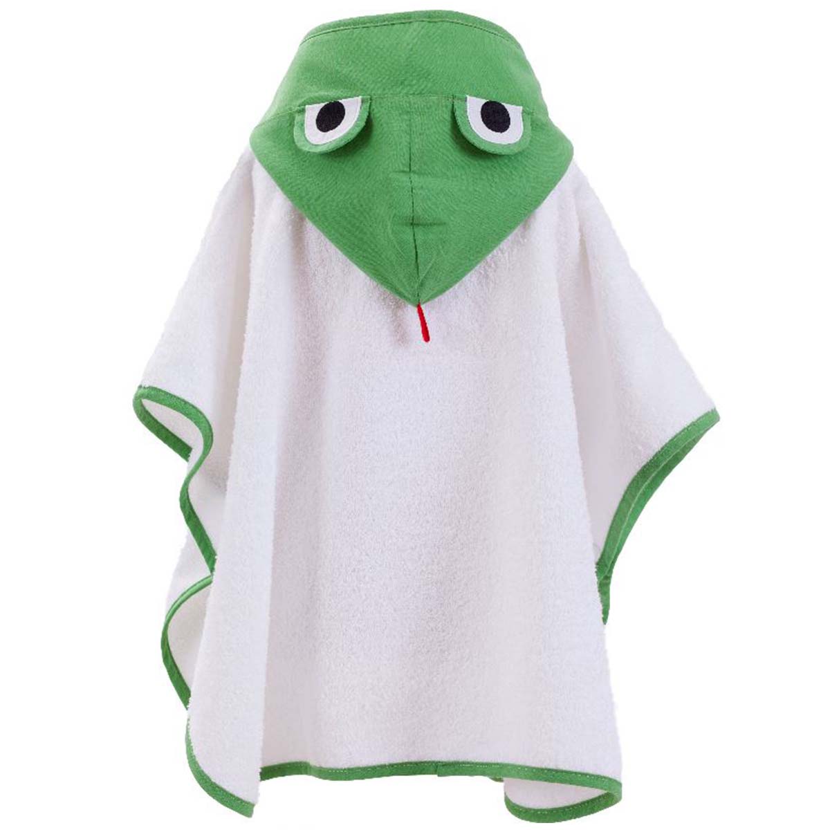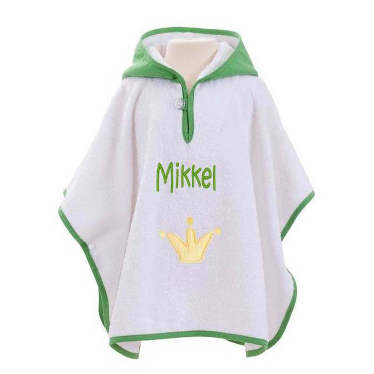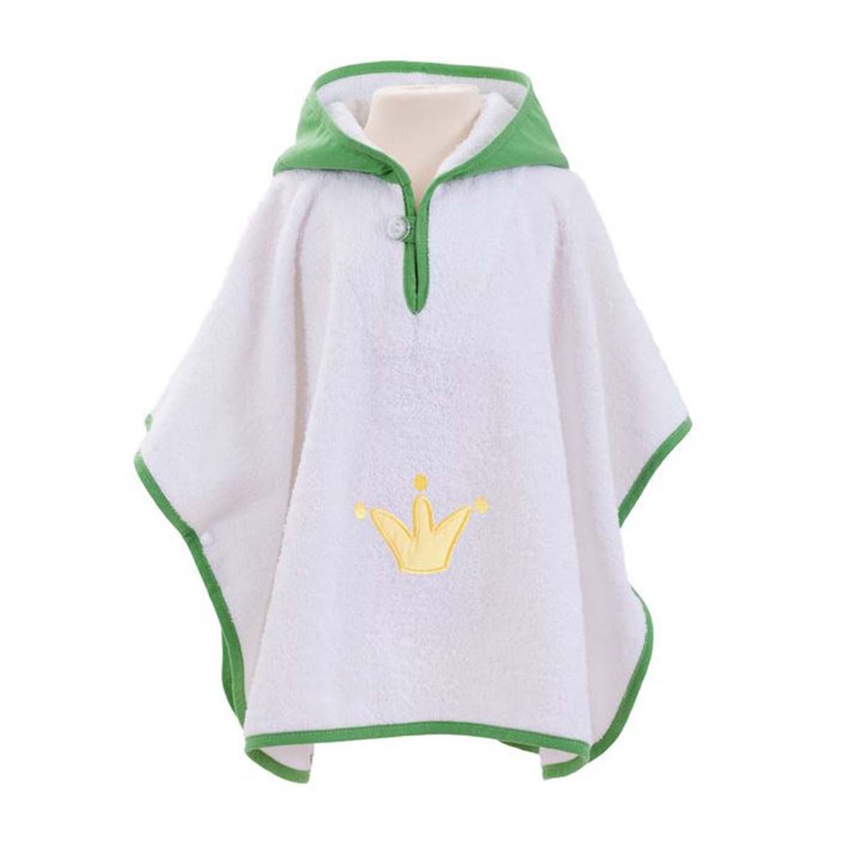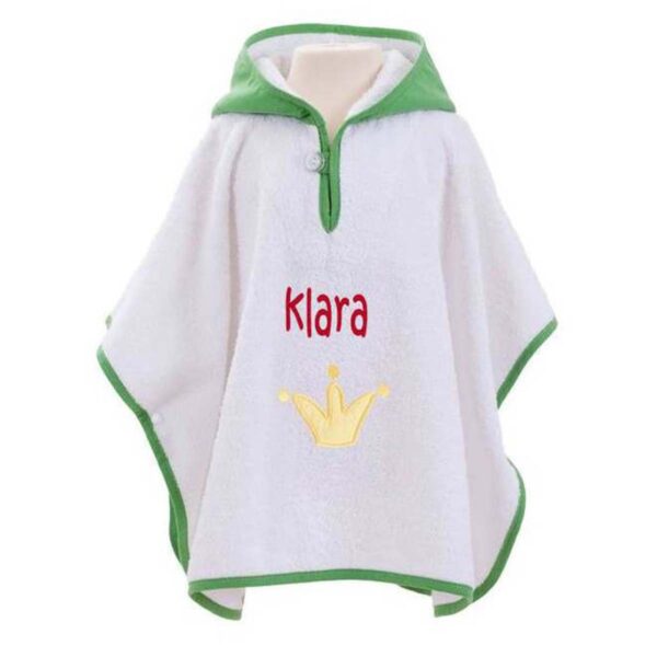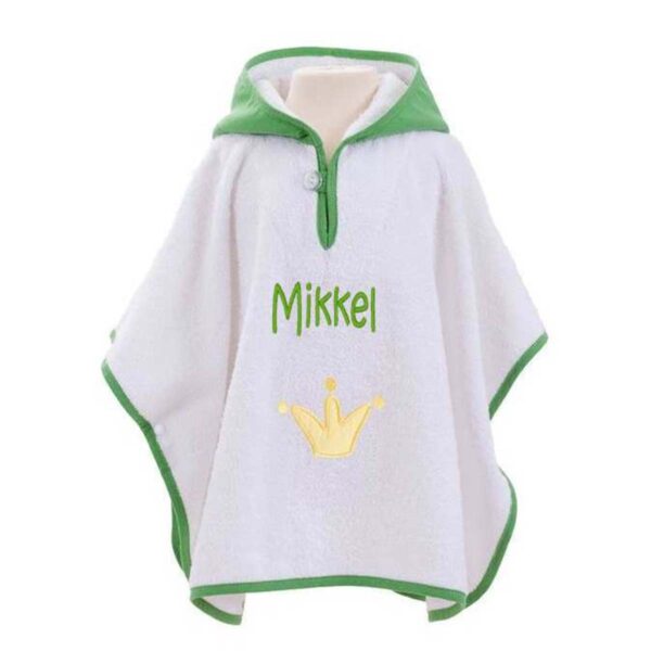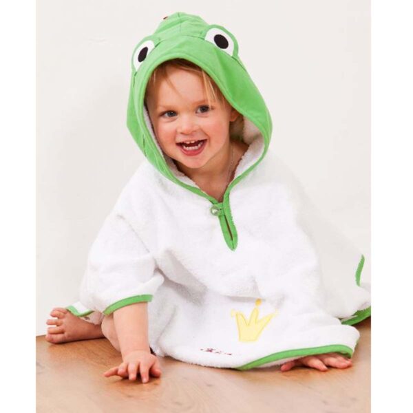 Denne skønne badeponcho i hvid frotte med en frisk grøn hætte og kant er det perfekte alternativ til en morgenkåbe. Ponchoen har en fin krone applikation foran og en hætte, der er formet som en sød lille frø – et design, der helt sikkert vil få dit barn til at smile.