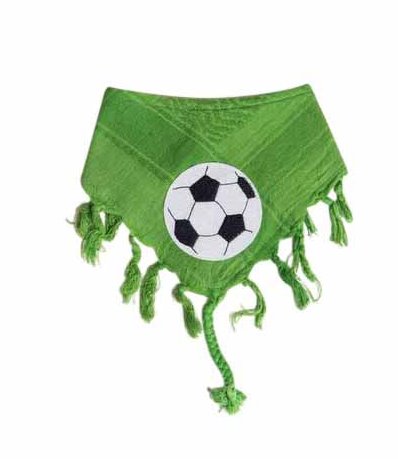 Fræk grøn bandana lavet af et partisan tørklæde, med et motiv af en fodbold.Savlesmækken har velcro luk i nakken og bagsiden er i blød frotte.