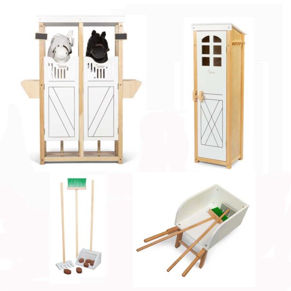 Pakken indeholder:1 stk. kæphestestald1 stk. Staldskab1 stk. trillebør1 stk. staldredskaber