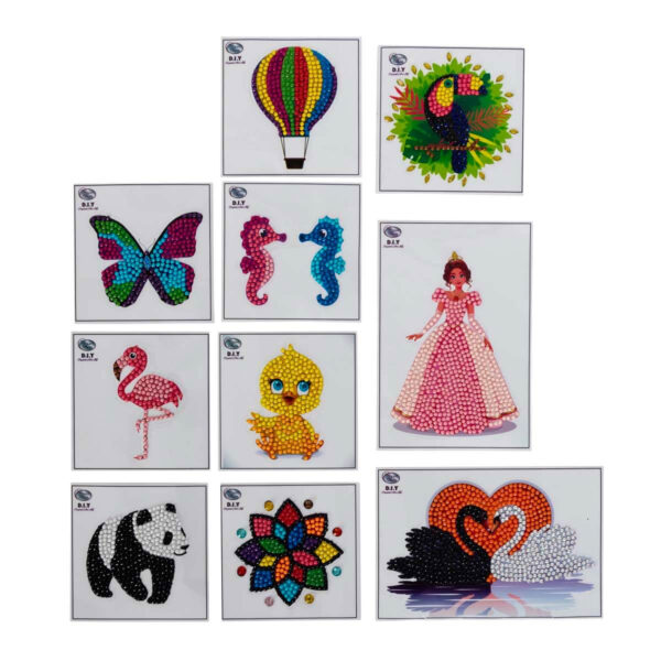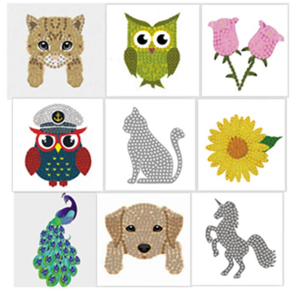 Sættet indeholder- 1 motiv stickers, lige til at klistre over på noget andet- 1 krystal “pick up pen”- 1 skål til krystal perlerne- jelly wax til krystal perlerne- Krystal perler i forskellige farver, der passer til motivet