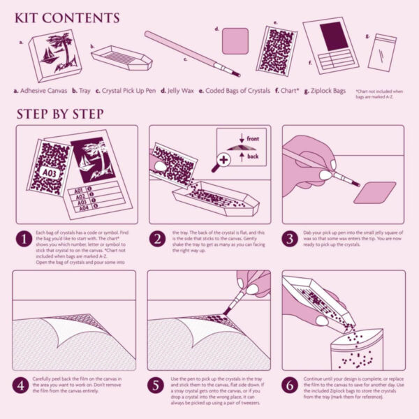 Krystal motivet er sjovt at lave – Teknikken ligner lidt maleri efter tal, og kaldes undertiden “diamantmaleri”. Hvert krystal motiv har et tal og en farvet klæbende skabelon, brug den medfølgende pick up pen sammen med jelly was, ved blot at løfte de farvede krystaller op og placere dem på de tilsvarende prikker med samme farve og tal. Krystallerne klister øjeblikkeligt! Teknikken er afslappende og terapeutisk, og resultatet er et smukt stykke kunst med rhinstene.