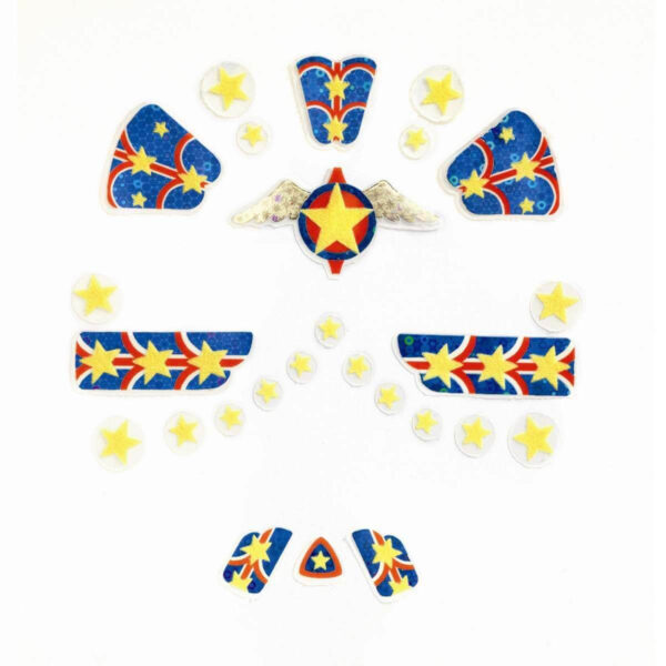 - Med disse klistermærker kan børn slippe deres indre superhelt løs. De kan skabe seje og farverige ansigtskunstværker på et øjeblik og træde ind i en verden fyldt med heltemod og eventyr. Der er masser af muligheder for at kombinere de forskellige klistermærker og skabe et helt unikt look.