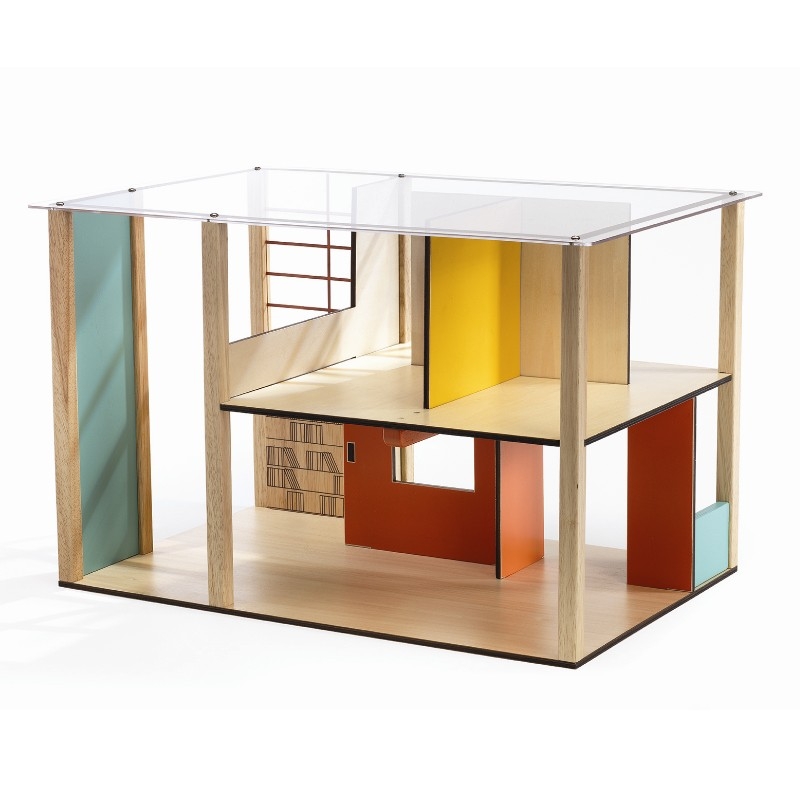 Dukkehuset er designet efter moderne arkitektur, og har derfor store vinduesfacader, og flotte farvedevægge der adskiller rummene i de åbne flader.