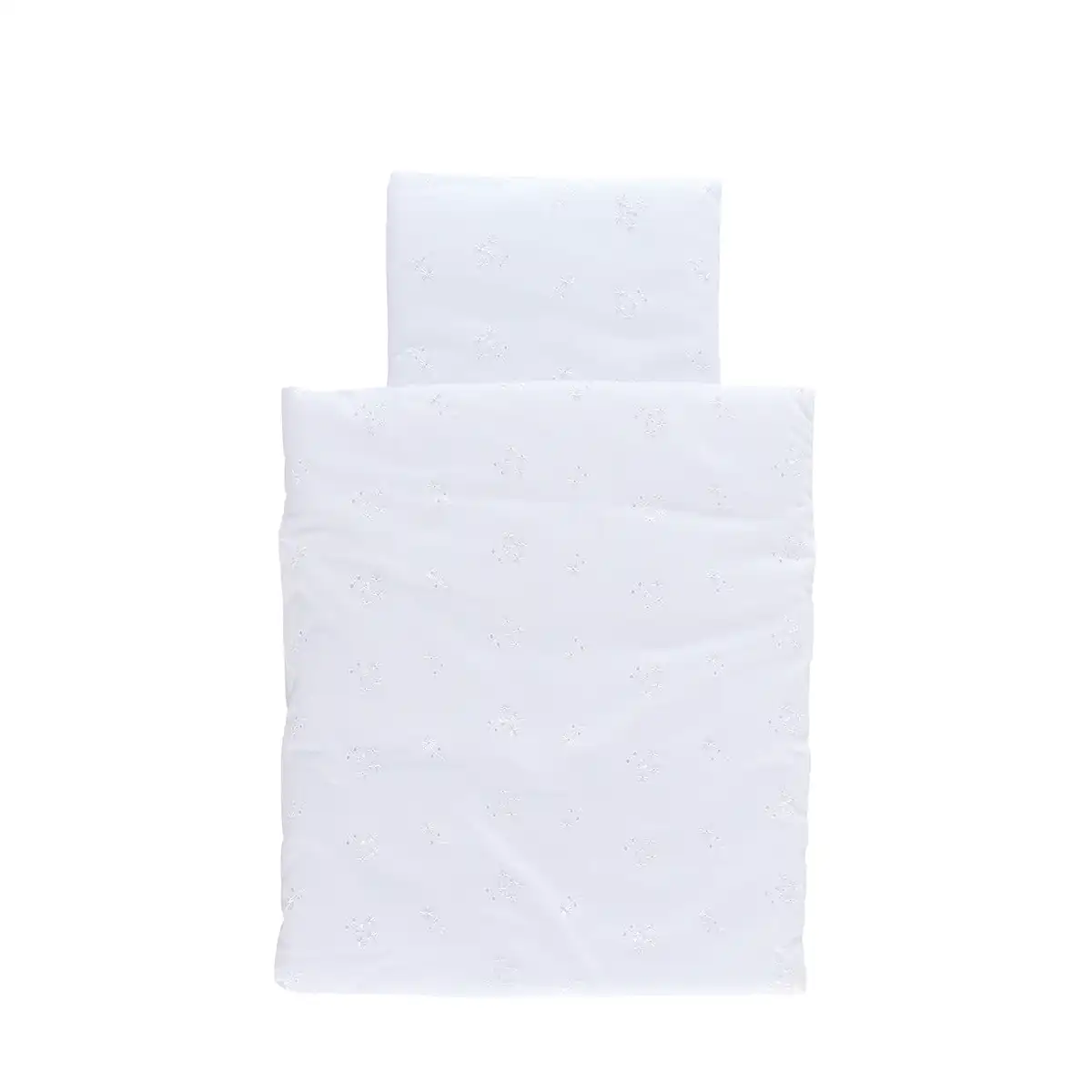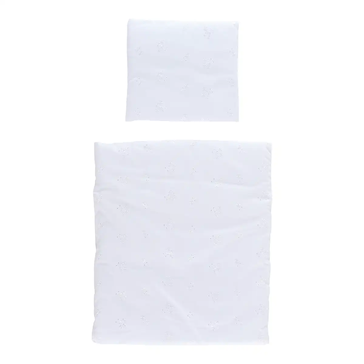 Dukkesengetøj til dukker hvidt broderi anglaise – Et elegant dukke sengesæt i hvid med broderi anglaise, som fuldender dukkevuggen og gør legen ekstra hyggelig.