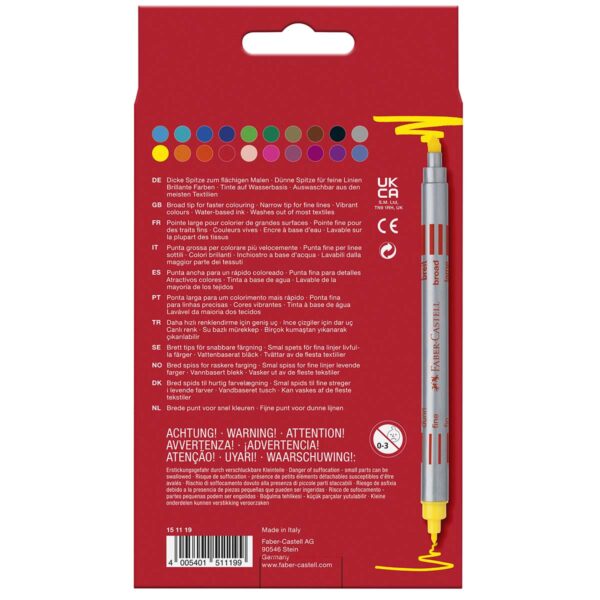 Med Faber-Castell dobbelt tusser kan dit barn udforske sin kreativitet og skabe smukke kunstværker med en bred vifte af klassiske farver. De dobbelte ender giver fleksibilitet og variation i tegneteknikker, og den vaskbare farve gør dem praktiske for både børn og forældre. Uanset om dit barn er en spirende kunstner eller bare elsker at tegne for sjov, vil disse tusser fra Faber-Castell være det perfekte redskab til at bringe deres ideer til live.