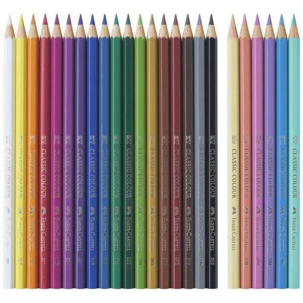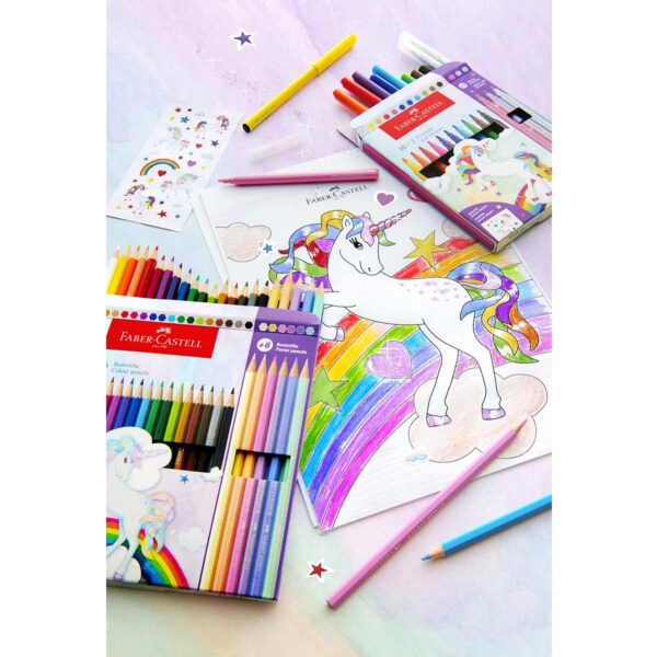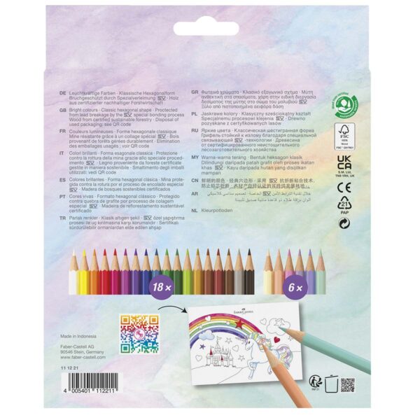 Faber-Castell farveblyanter 18 + 6 stk. Enhjørning pastel er en pakke af klassiske trekantende farveblyanter. Pakken indeholder 18 stk. farveblyanter i klassiske farver og nuancer, samt 6 stk pastel . De fine farveblyanter er med brudsikker stift pga. en speciel limning, hvilket gør at de ikke er svære at knække, mens der tegnes med dem.