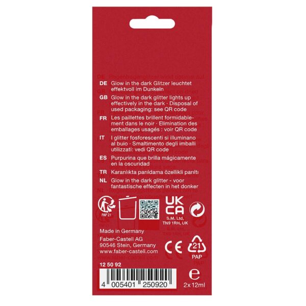 Glitter tuberne fra Faber-Castell er CE-mærkede og sikre for børn. Konsistensen er som gel, hvilket gør det nemt at styre påføringen. De kan bruges både derhjemme og i skolen til kreative projekter.