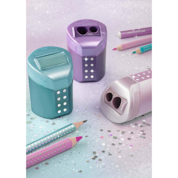 Faber Castell Sparkle jumbo blyanter Violet er et kvalitetssæt bestående at 3 jumbo sparkle blyanter, et viskelæder og en blyantsspidser. – Alle fra Sparkle serien, med glimmer detaljer og grip, så der er sikret et godt hold om redskaberne. De fine blyanter er med brudsikker stift pga. en speciel limning, hvilket gør at de holder længere og ikke bryder tegne/skrive processen, pga. en knækket stift. Alt i alt et kvalitetssæt som dit barn vil få stor glæde af.