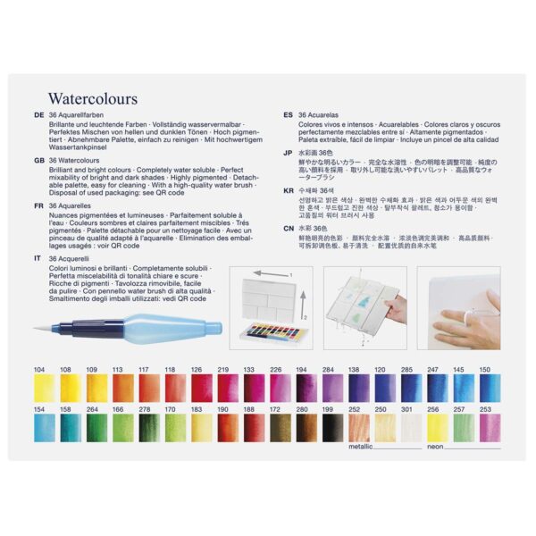 - Praktisk og Holdbar Plastæske – Akvarelfarverne kommer i en robust plastæske, der kan vaskes af efter brug. Dette sikrer, at farverne altid er organiserede og beskyttede, hvilket gør det nemt at tage sættet med overalt. Æsken er også ideel til at holde arbejdsområdet rent og ryddeligt.