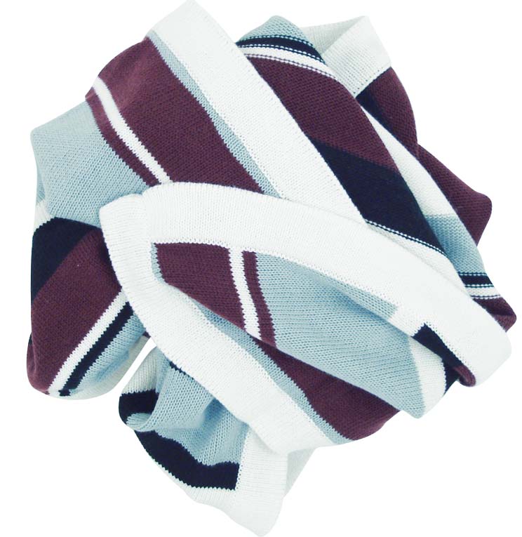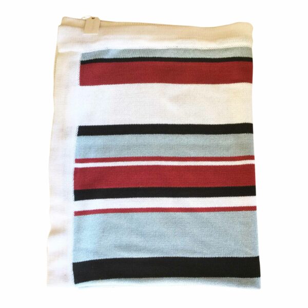 Tæppet er lyseblå, sort, rød og hvid stribet.