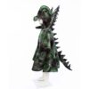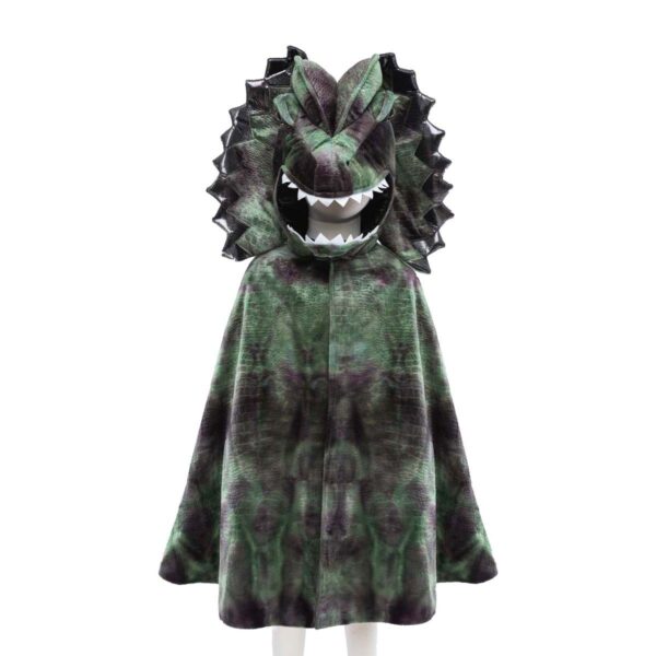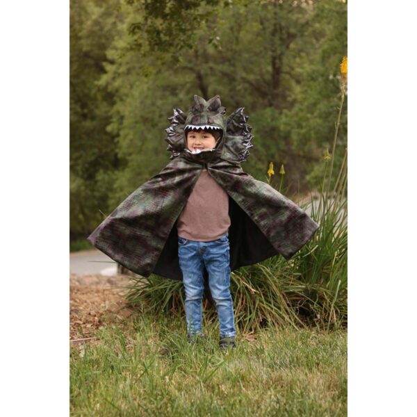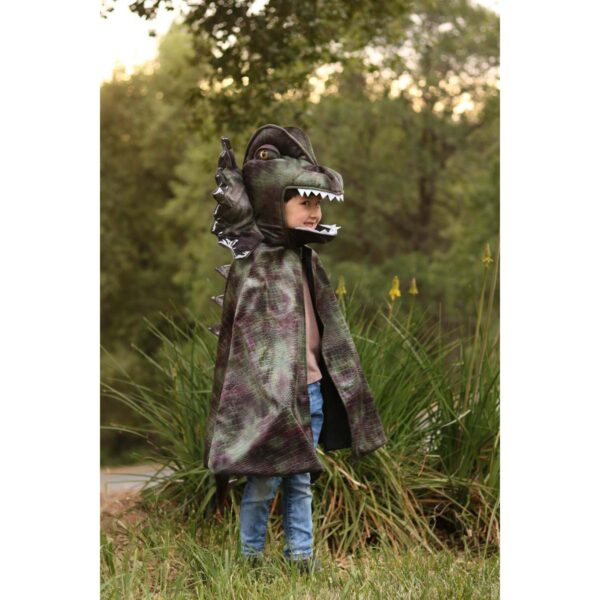 Kappens naturlige grønne nuancer og guld farvede dekorationer fremhæver den imponerende skalastruktur, der er indgraveret i det bløde stof, hvilket tilføjer en autentisk og farlig aura til dragens udseende. Med hætte, dragehoved og imponerende krave bringes kostumet til live, og velcro-lukningen gør det nemt for den lille drage at tage det af og på.