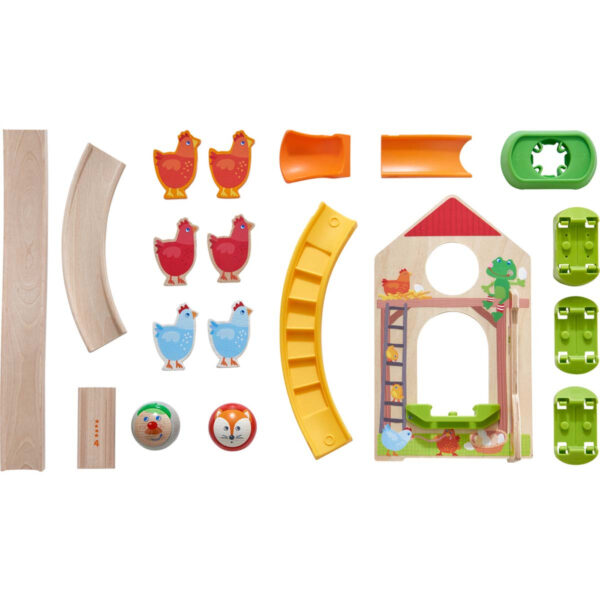 HABA Kullerbü kuglebane Hønsegård – Hvem fanger hønsene først, bondemanden eller den frække ræv? Med Kullerbü kuglebane Hønsegården kan man vælte høns hele dagen. Send kuglen rullende ned ad banen, sigt efter hønsene, og se, hvem der vælter flest, ræven eller bondemanden. Den perfekte kombination af sjov, spænding og motorisk træning for børn fra 2 år og op. Banen kan kombineres med andre HABA kuglebaner for endnu større eventyr.