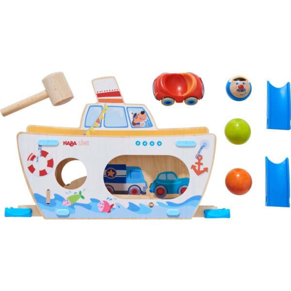 HABA Kullerbü kuglebane tilbehør hammer bræt skib – Sæt sejl og gør klar til sjov og action fyldt leg med Kullerbü Skib med Hammerbræt! Dette kreative tilbehør kombinerer klassisk hammerleg med Kullerbü kuglebanens unikke univers. Med hvert sendes kuglerne sikkert afsted, klar til nye eventyr på de farverige skinner.
