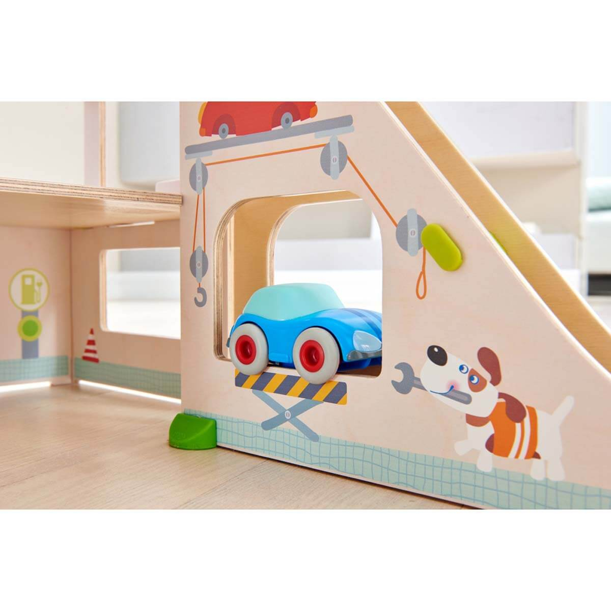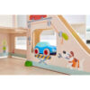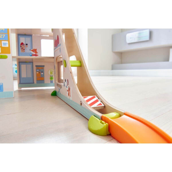 HABA Kullerbü kuglebane tilbehør parkeringshus – Velkommen til Kullerbü parkeringshus – Et centrum for action, sjov og kreativ leg. Dette imponerende parkeringshus er designet til at udvide dit barns Kullerbü univers og tilføjer et helt nyt niveau af sjov til kuglebanen. Med flere etager, en elevator og en helikopterlandingsplads på taget er der uendelige muligheder for at udforske, parkere og flyve. Biler kan rulle op og ned ad ramperne, tage elevatoren op til toppen eller parkere i de mange pladser. Helikopteren kan lande på taget, klar til at tage af sted på næste mission.