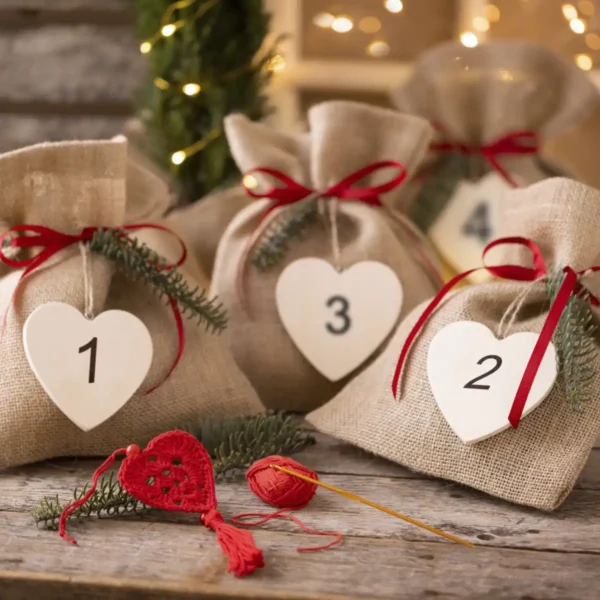 - De nummererede træhjerter og røde bånd skaber en magisk julestemning, der gør ventetiden til juleaften helt særlig.