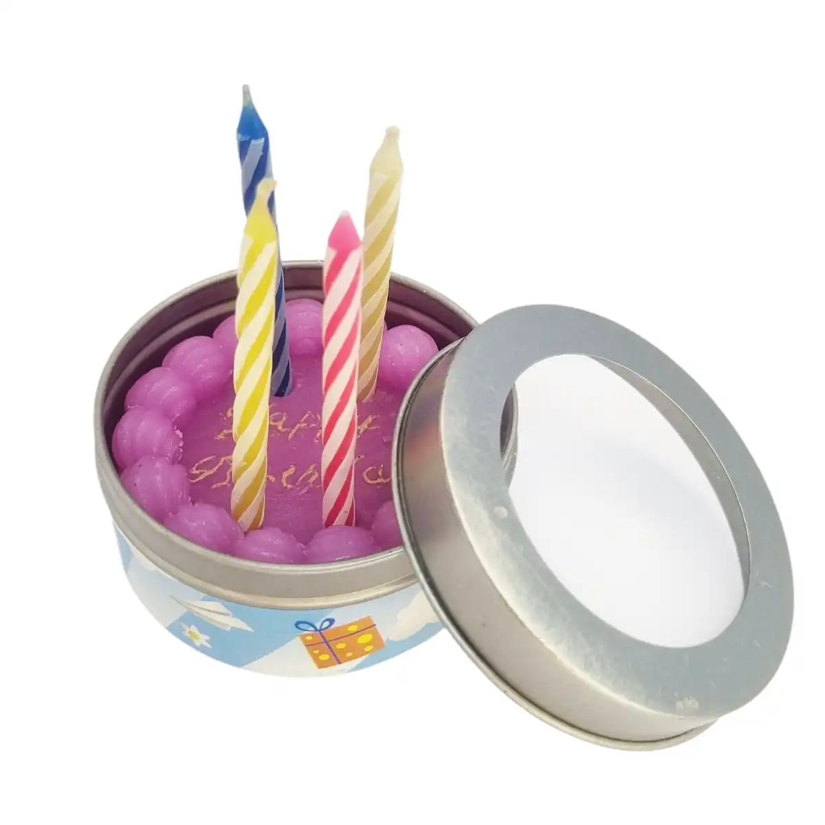Overrask en du holder af med en lille, farverig fødselsdagskage i stearin – komplet med fire små stearinlys i blå, pink og gul. Fødselsdagslysene er samlet i en dekorativ mini-kage, der ligger i en fin metalæske og er lige til at tage med, sende eller stille diskret frem på bordet. Perfekt til arbejdspladsen, studiet, værtindegaven – eller som en sød hilsen til én, du gerne vil glæde på afstand.