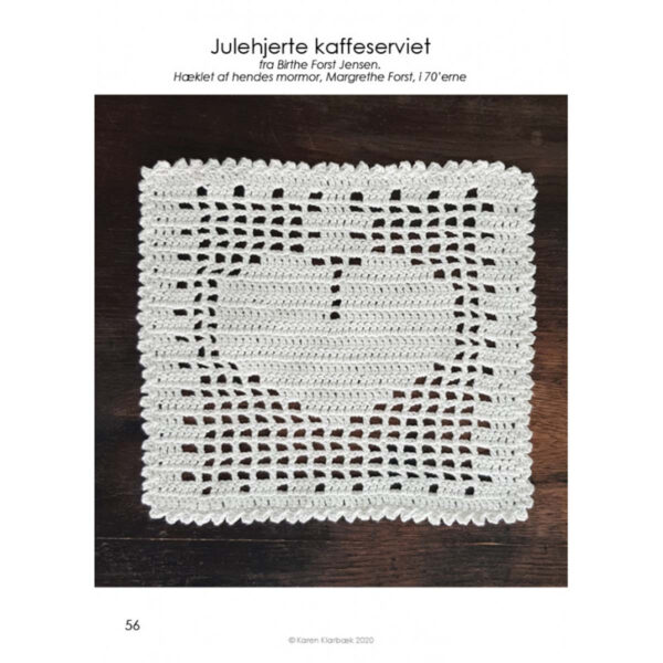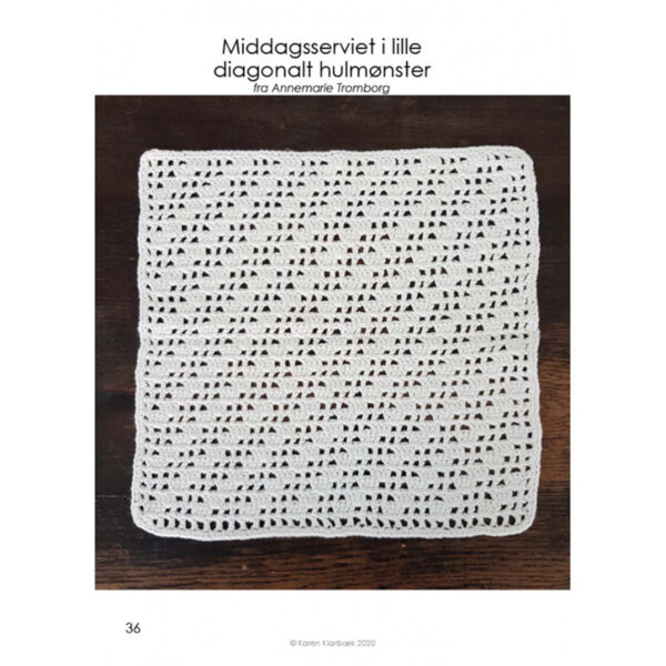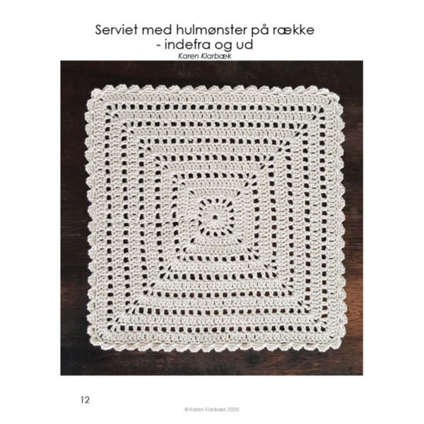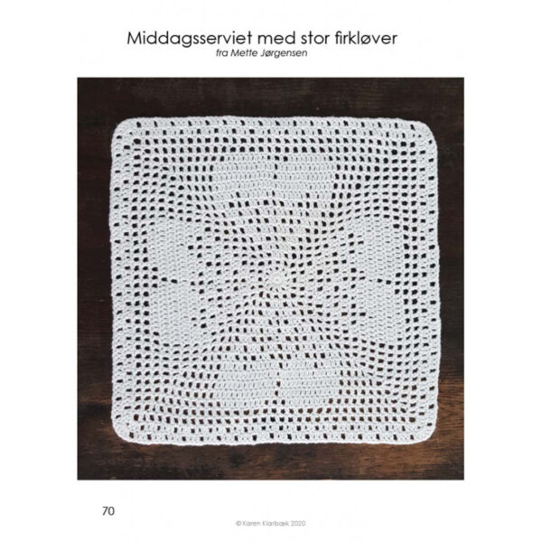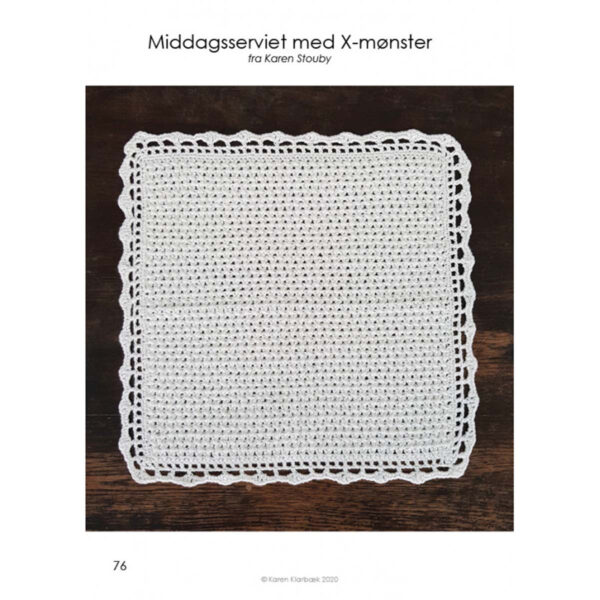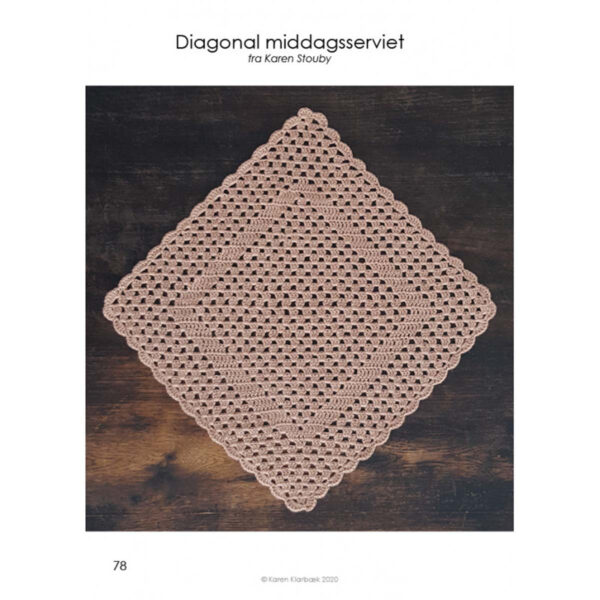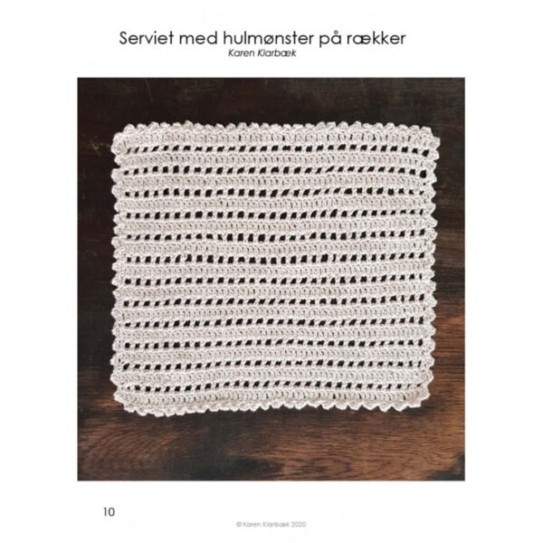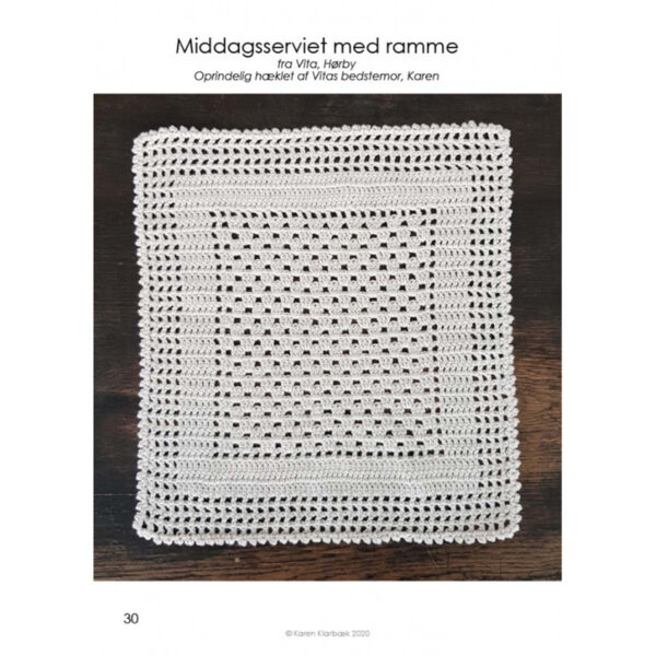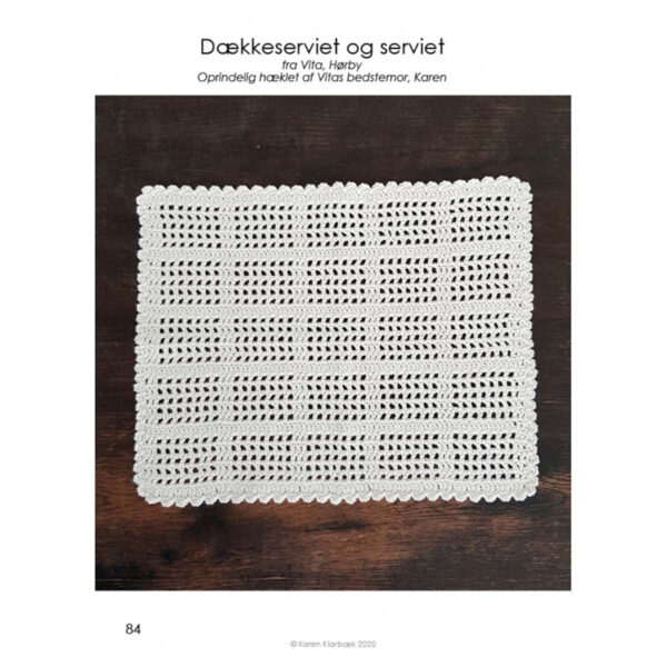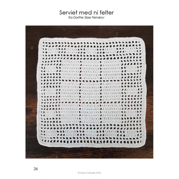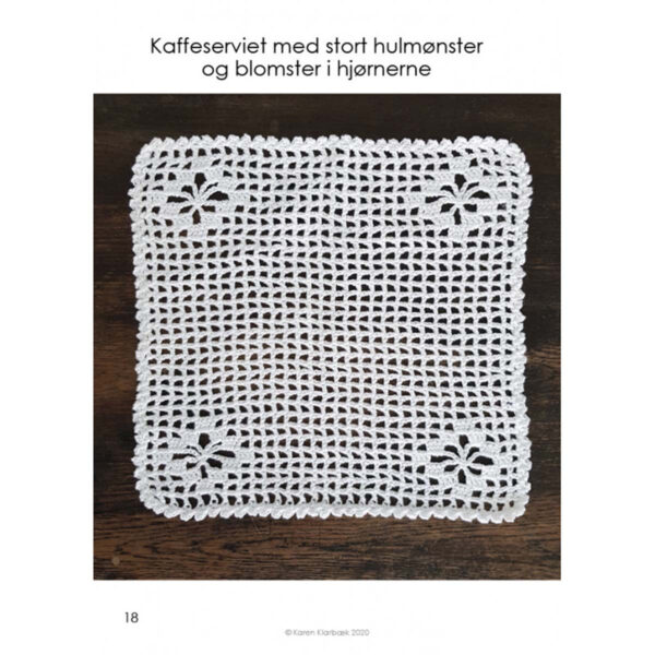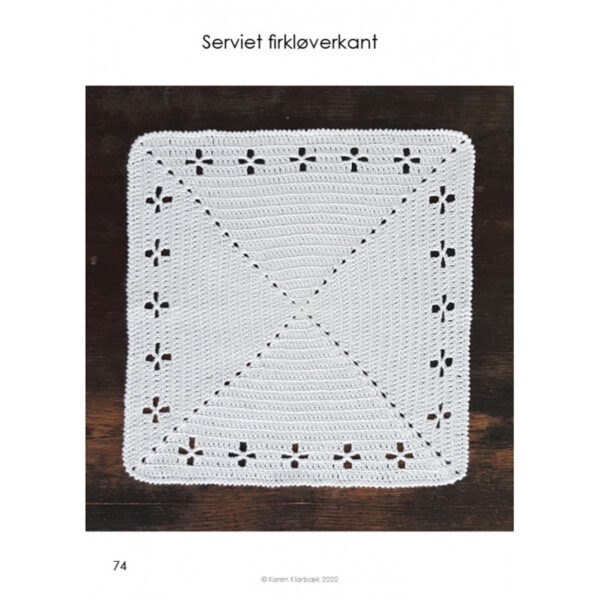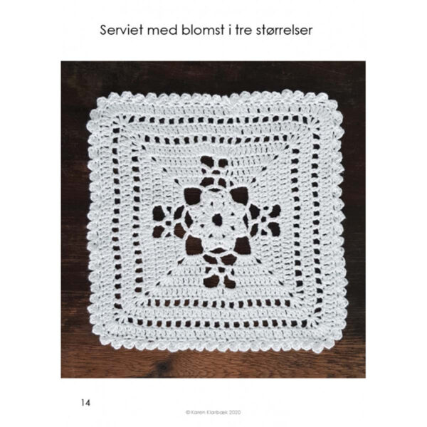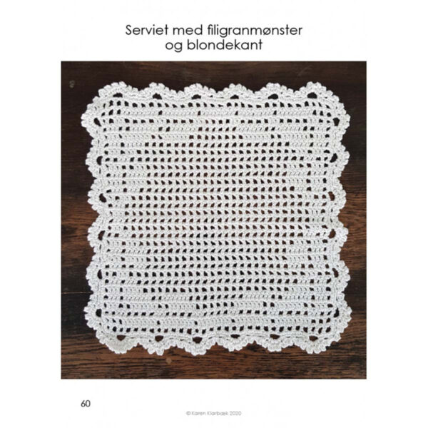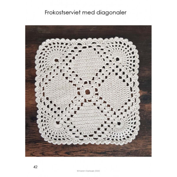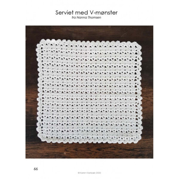 Karen Klarbæk skriver: “Da hun var lille pige, samlede hun på papir servietter, det var som alle andre samlinger, at finde de særlig fine servietter, dem der var anderledes. Som voksen har hun samlet på hæklede servietter af samme ønske, men allermest ønsket om at håndarbejde skal have værdi”. For Karen er det historien om værdien af håndarbejde, som ikke må forsvinde. Alle servietter i bogen er hæklet i mit Karen Klarbæks eget garn, som er fremstillet af økologisk bomuld.