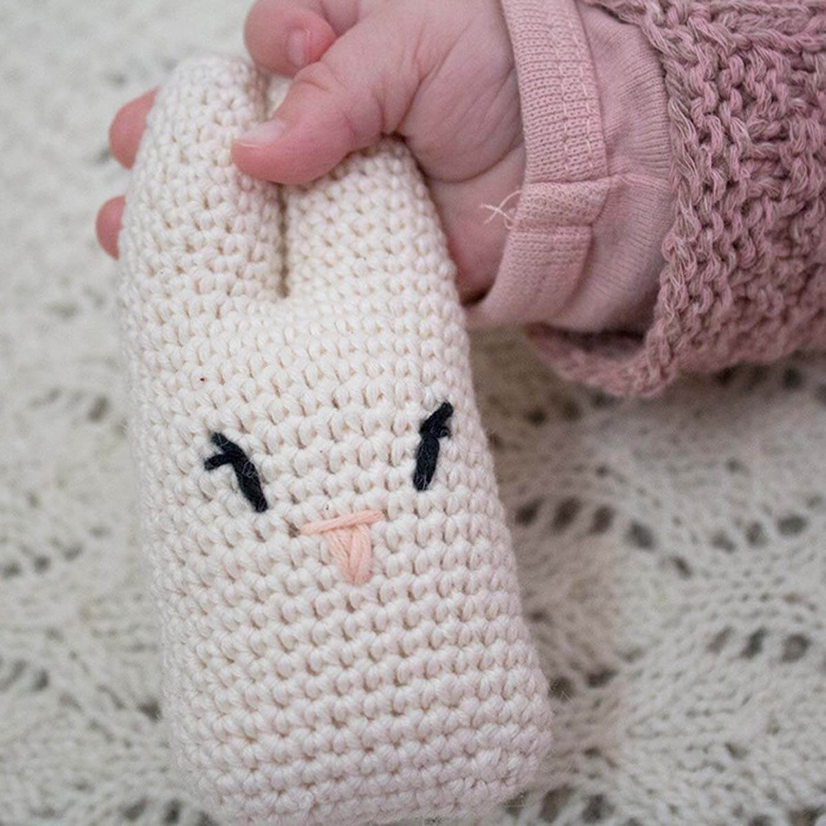 Rigtig fin hækle opskrift på sød og sjov raslekanin med rasleboks indeni, som laver små raslelyde når babyen ryster med den. Raslekaninen er ca. 11 cm lang og passer godt i en lille babyhånd.