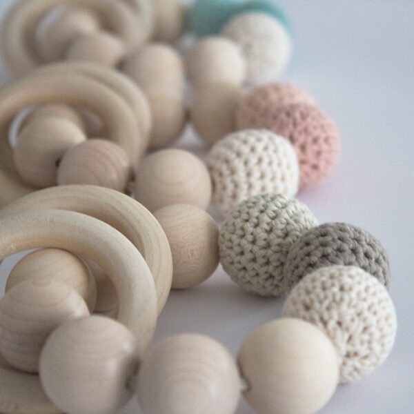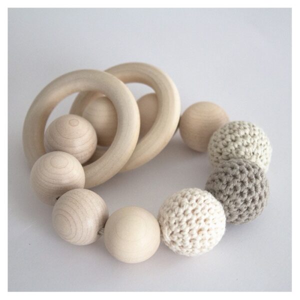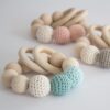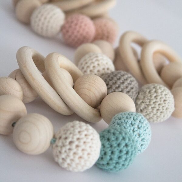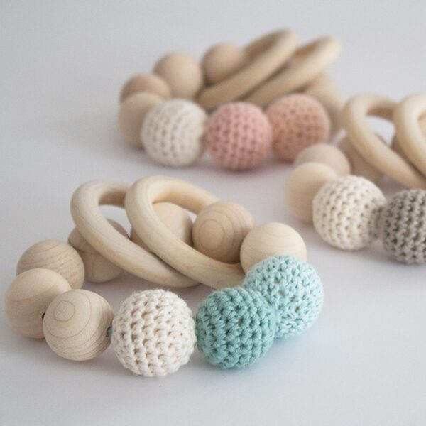 Rigtig fin hækle opskrift på sød og sjov rasle rangle til baby med trækugler.
