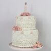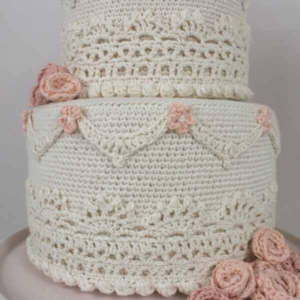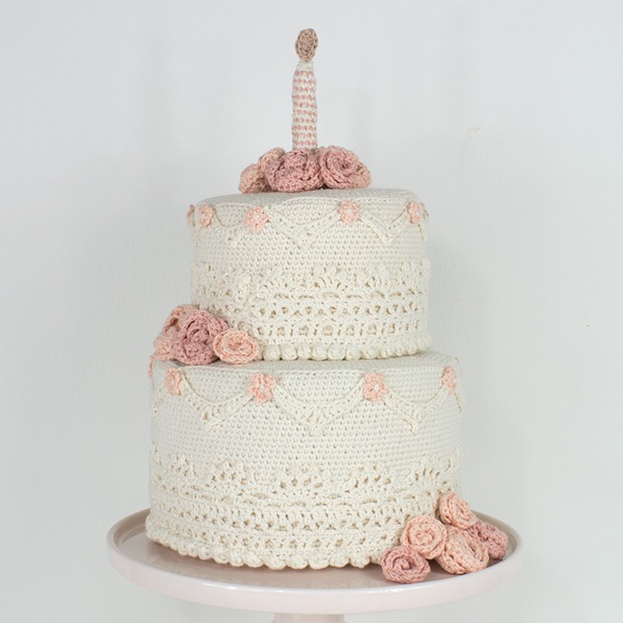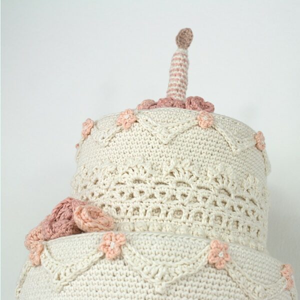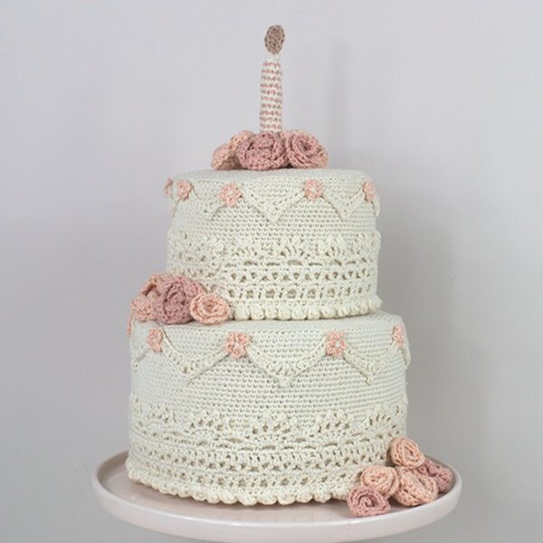 Smuk hæklet lagkage fra Krea Deluxe.Lagkagen kan bruges til mange forskellige lejligheder og har flere forskellige anvendelsesmuligheder. Brug den i legekøkkenet, lav flere lys lav flere lys i andre farver og brug den på fødselsdagsbordet, brug den som sangskjuler til et bryllup, en konfirmation eller en barnedåb.