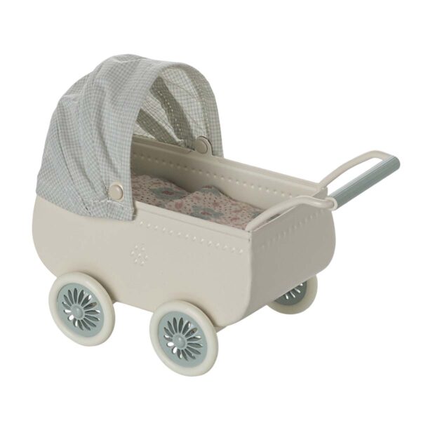 Når mus og kaniner skal på tur, må de små selvfølgelig med, og her er en barnevogn ikke til at undvære. Den blå dukkevogn er lavet i metal og har et romantisk, gammeldags udtryk. Den passer sammen med resten af møblerne i Maileg dukkehuset, og det gør det let at skabe en rød tråd i indretningen. Du kan stille vognen ved sengen, i gangen eller tage den med udenfor. Den kører godt på både gulvtæppe og trægulv. Vognen passer til både mikro mus og baby kaniner, og den er lige til at tage med i legen.