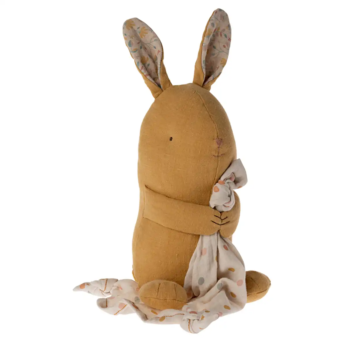 Maileg Lullaby Friends kanin i støvet gul er en blød ven til de mindste. Hun spiller Mozarts vuggevise, når du trækker i halen, og melodien giver en rolig atmosfære ved sovetid. I favnen holder hun en nusseklud, der kan tages ud og bestilles med barnets navn. På den måde bliver kaninen hurtigt en helt personlig ven, som barnet kan have glæde af i mange år.
