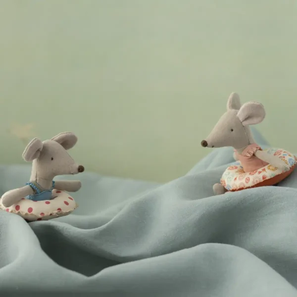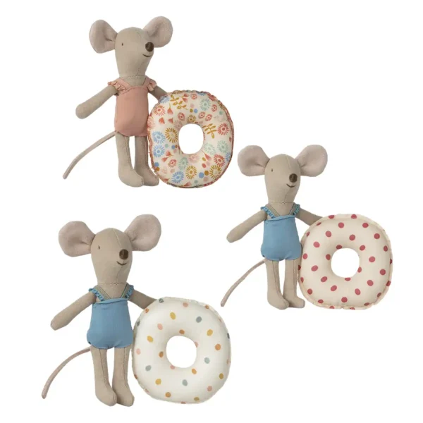 Lillesøstermusen fra Maileg er klar til ferie. Med sin fine badedragt og badering er hun helt med på sommerstemningen. Hun elsker at tage på stranden eller i svømmehallen. Hun er lille og let og passer perfekt til børns leg – både hjemme og på ferie. Musen har sin egen badering med sig, lavet i flot og farverigt stof. Den kan tages af og på, så legen kan skifte retning. Hun har også sin badedragt på, som matcher farverne og stemningen. Alt er lavet i bløde materialer, som føles rare i hånden.