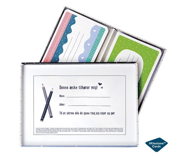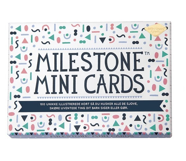Æsken indeholder 100 flot illustrerede mini milepælskort. De dækker alt fra sjove citater til store udviklingsspring. Du kan skrive datoen på kortet, tage et billede af barnet sammen med kortet eller gemme det i en mindebog.