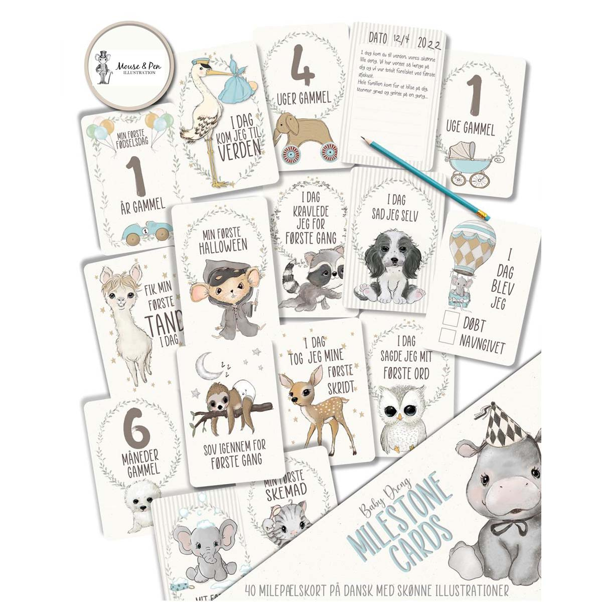 Mouse & Pen er et dansk brand, kendt for deres smukke håndtegnede illustrationer. Alle deres produkter er designet med kærlighed og sans for detaljer. Deres milepælskort er skabt til at hjælpe forældre med at bevare de dyrebare minder fra barnets første år. Med en kombination af æstetik og funktionalitet skaber Mouse & Pen produkter, der bringer glæde og nostalgi i mange år frem.