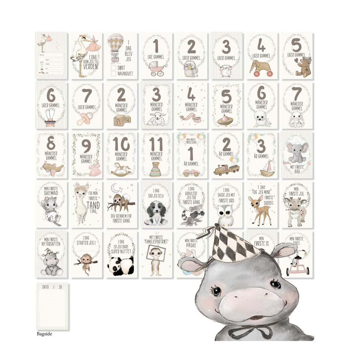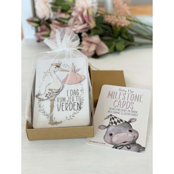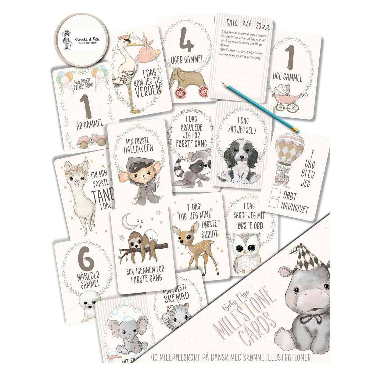 Denne pakke indeholder 40 forskellige milepælskort, der dækker alle barnets første store oplevelser. Fra første gang baby griner, til den første fødselsdag – alt kan dokumenteres.