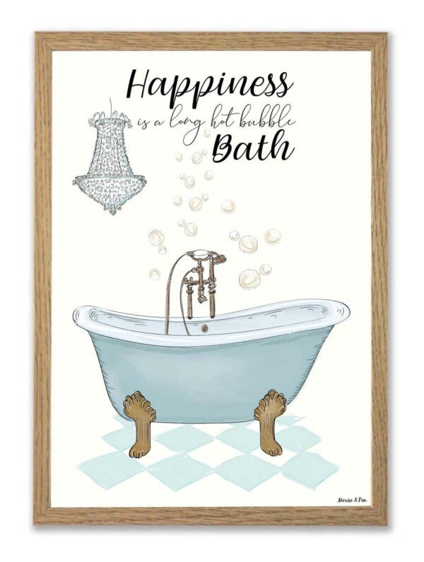 Køb en flot plakat i A4 str. med teksten “Happiness is a long hot bubble bath” fra Mouse & Pen.