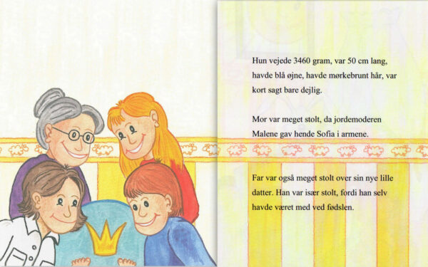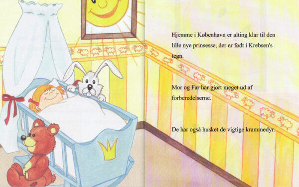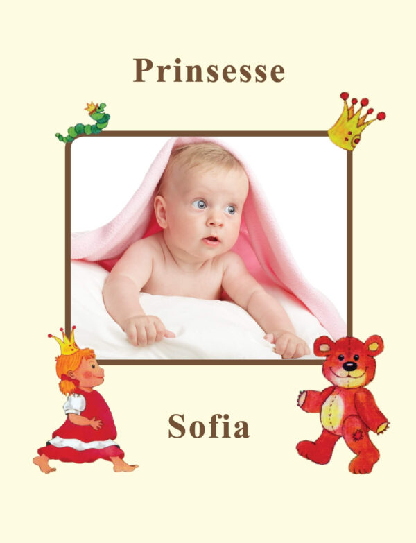 Barnets personlige dåbsbog, hvor den lille ny prinsesse kommer på en tur til Fantasiens Kongerie, hvor hun bliver kronet. Babybogen er en unik personlig dåbsgave med alle oplysninger fra pigens fødsel flettet ind i eventyret. Babybogen indeholder barnets fulde navn, fødsesldato og tidspunkt, mor og far, de første besøgende, hjemby, vægt og længde, hår og øjenfarve, fødested og stjernetegn samt naturligvis din personlige hilsen til den lille ny prins. Du kan i bestillingen vælge om bogen skal være uden en Far, dvs til en alene Mor. Barnets personlige bog har 36 sider, er 17,5 cm bred og 21 cm høj, har et hårdt omslag og farvesider. Til barnets personlige bog er der mulighed for at få et billede af barnet trykt med ind i bogen. Billedet bliver bogens første side, printet på mat 170 grams eller blankt 200 grams Canon fotopapir. Hvis der ikke vælges mellem mat eller blankt billede, bliver billedet automatisk bestilt med mat billede. Der kan bestilles en fotolomme/chartek med hvidt papir bagerst i bogen. Kan evt. bruges til at gemme billeder eller små historier.