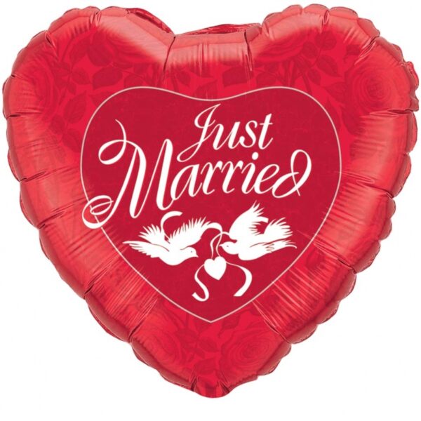 Ud over de mindre latexballoner fås også en stor hjerteformet folieballon i rød med hvidt tryk af turtelduer og teksten Just Married. Den måler hele 91 cm i bredden og egner sig særligt godt som centerpiece eller til brug ved fotobaggrunde. Den kan pustes op med helium for at svæve eller bruges med luft til ophæng på væg, dør eller borddekoration. Folieballonen er slidstærk og holder luft i flere dage.