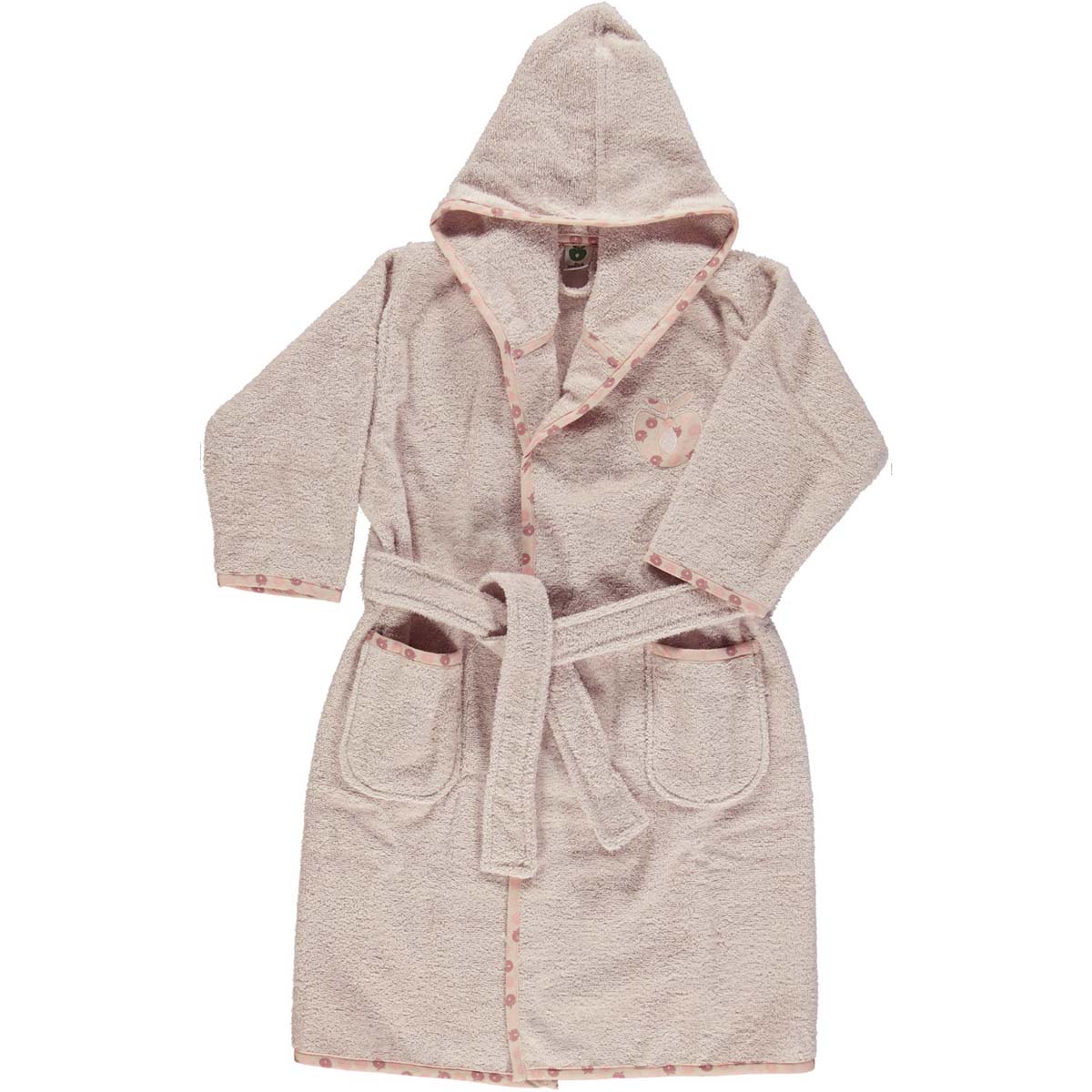 Lækker luksus badekåbe fra Småfolk. Badekåben fås fra str. 1 år til 6 år. se de forskellige størrelser under vælg størrelse. Badekåben er flot sart rosa i lækker frotte med en flot klassisk lyserød æblekant, og applikeret æble på den ene side. Badekåben er super lækker til barnet efter bad, til babysvømning, en tur til strande, eller bare til hygge. Hvis det ønskes kan der broderes navn på badekåben. Der broderes i valgfri skrift og farve på badekåben .Badekåben er lavet af 100% lækker øko tex certificeret bomuld.