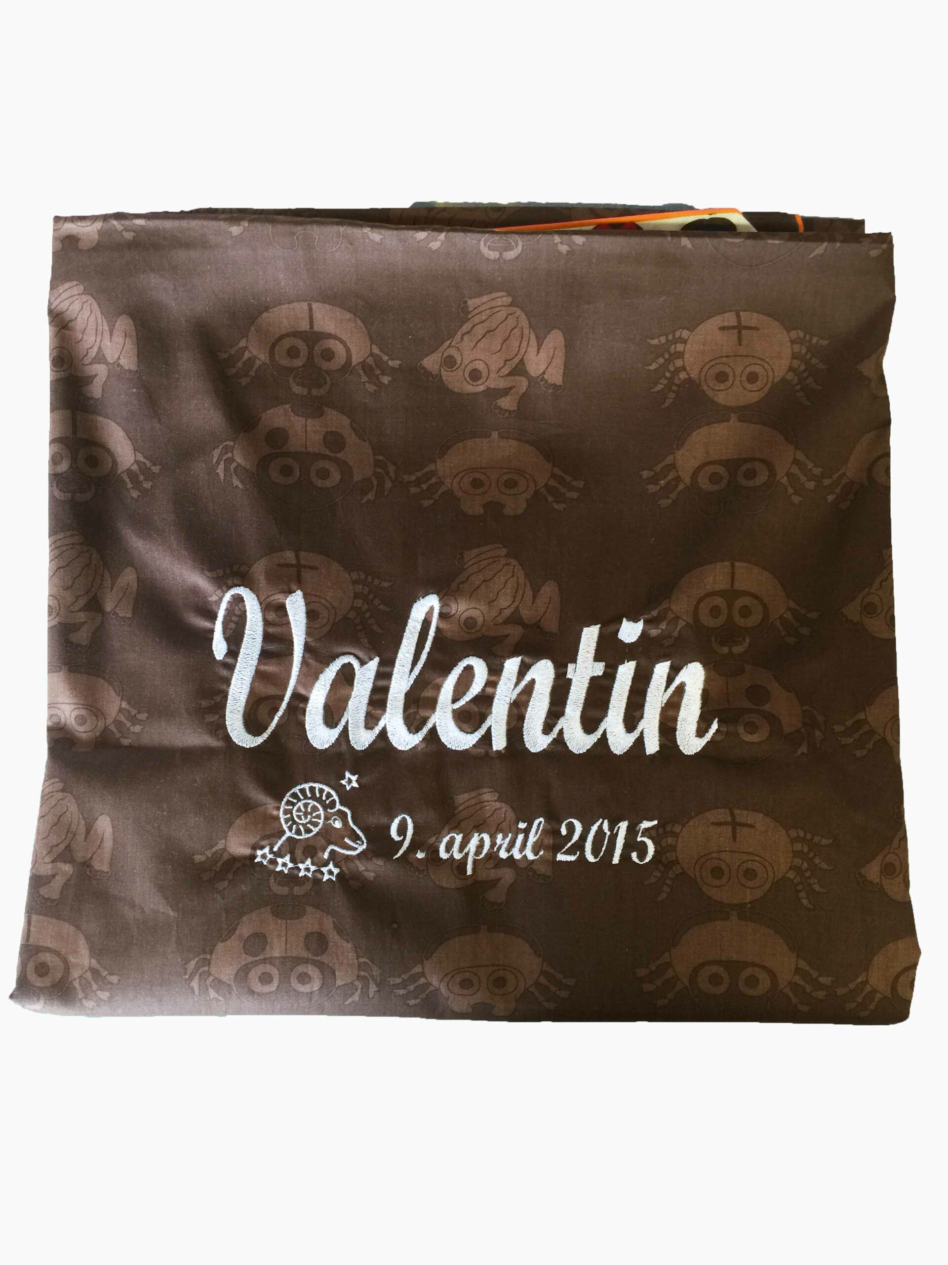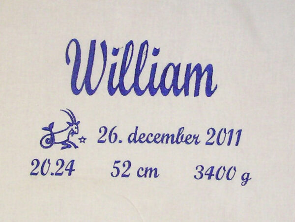 - Navn, dato og stjernetegn – Baby sengetøj broderet med stjernetegn ved barnets fødselsdag, der giver ekstra personlighed til sengetøjet.