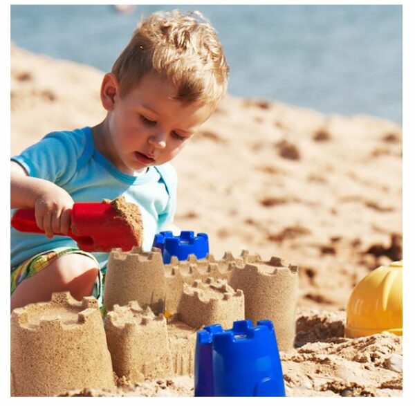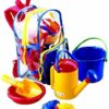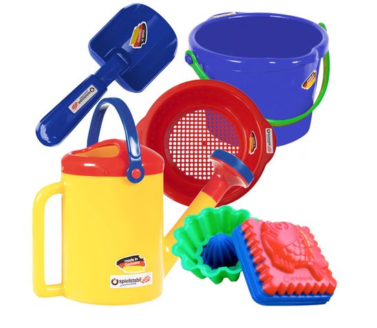Sættet består af en spand, si, vandkande, skovl og to små ocean sand forme.