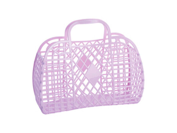 Retro 80’er hvor disse skønne kurvetasker i plast var et hit blandt mange, med stort flot hulmønster, tasken kommer udfoldet og samles i siderne. Sun Jellies tasken er velegnet til både badetøj, legetøj og som praktisk taske en tur i skoven eller til stranden. Tasken har stort rum med to håndtag i toppen, bunden er stabil, så kurven kan sagtens stå selv.