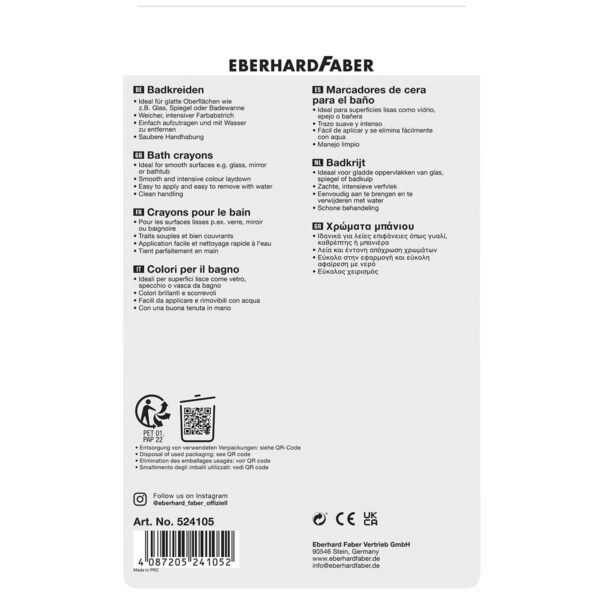 Bade kridt/farver fra Eberhard Faber er mere end bare en sjov badelegetøj; de er et redskab til kreativ udfoldelse, læring og leg. Børn kan nyde en verden af farver og former, mens de bader, og forældre kan være sikre på, at produkterne er sikre og lette at rengøre. Eberhard Faber fortsætter med at inspirere børn til at udforske deres kreative potentiale, og deres bade kridt/farver er et glimrende eksempel på dette engagement. Gør badetiden til en magisk oplevelse med Eberhard Faber bade kridt/farver!