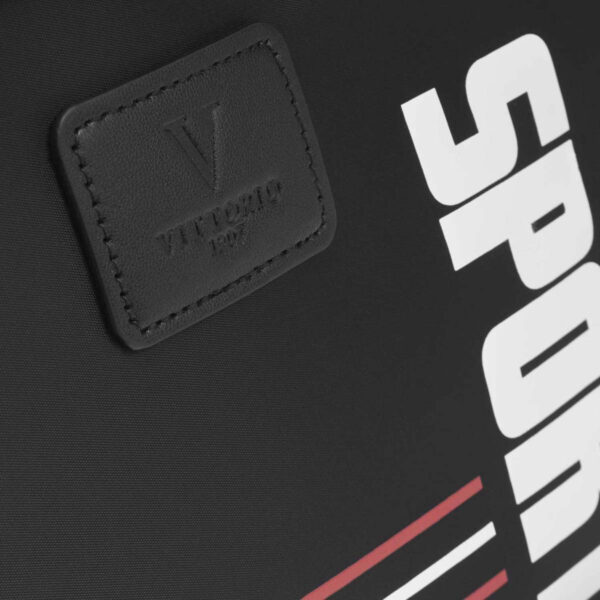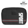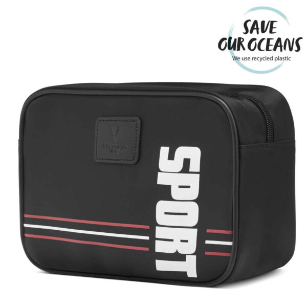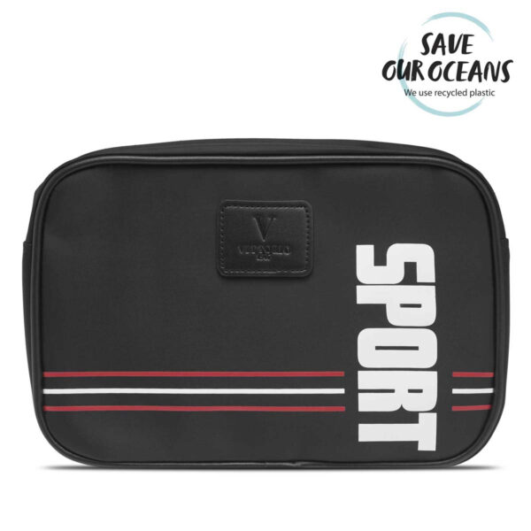Toilettasken er i sort satin look med teksten sport og har 2 røde og 1 hvid stribe, toilettaske er med sort lynlås og sort foer.
