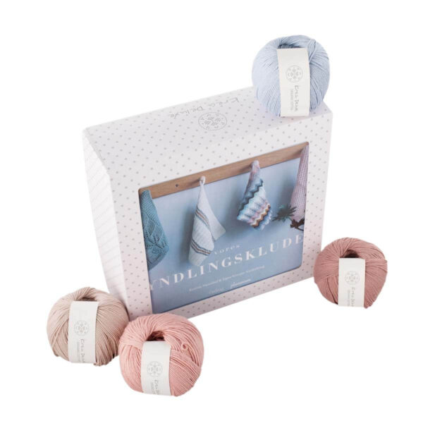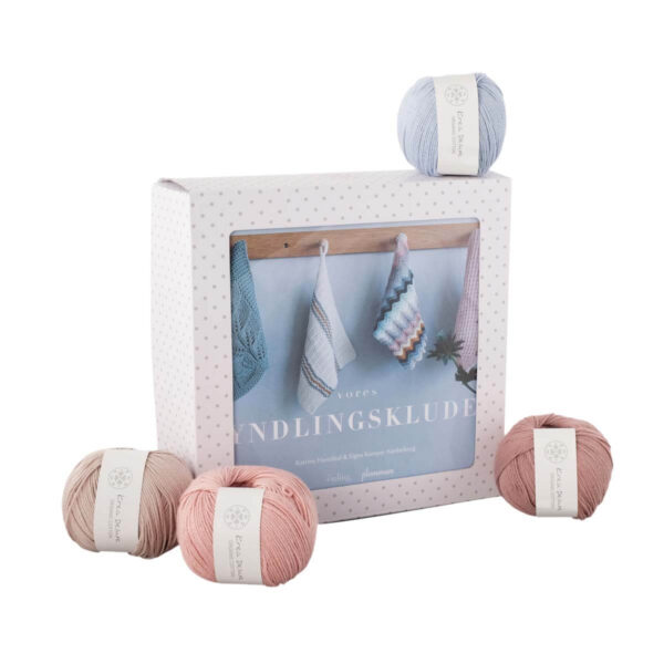Flot gaveæske med bogen Vores yndlingsklude er en vidunderlig bog fyldt med 20 strikke- og hækle opskrifter på lækre klude og 9 nøgler luksus bomulds garn.